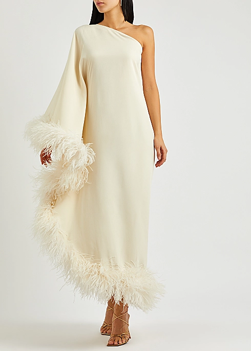 When it’s time raise a glass of Champagne, we’ll be toasting to Taller Marmo’s ivory Ubud dress. Embellished with a feather trim, this elegant one-shoulder style sweeps to an asymmetric hem for a show-stopping finish.
