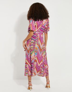 In a multicolour zig zag pattern, it’s serving summer vibes with a touch of elegance. With frill sleeves, V-neck and a fit and flare shape, this is the perfect piece for hot summer nights. Tie it as you wish at the waist with the matching tie belt.