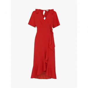 Whistles romantic red Abigail Frill Wrap Dress features a V frill neckline, a cinched in waist and exquisite relaxed skirt. A modern choice perfect for a wedding guest this season. Team with heels and a slim clutch for a beautiful look.