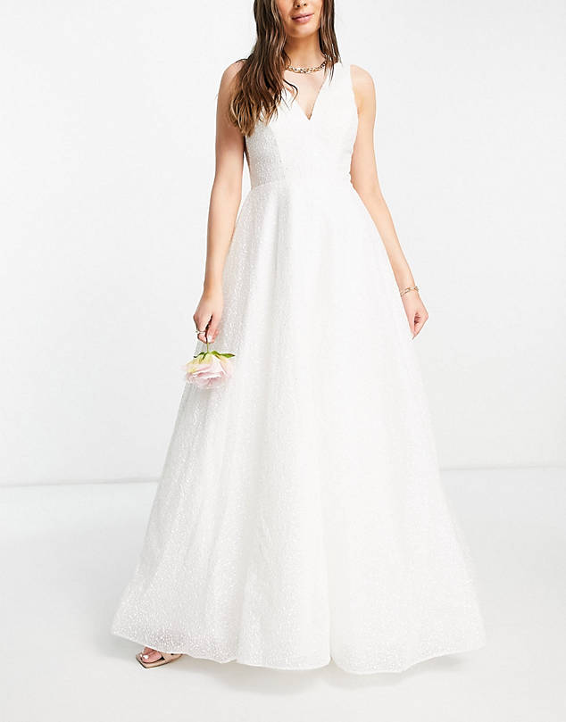 Y.A.S Bridal maxi dress with textured tulle skirt and v back in white